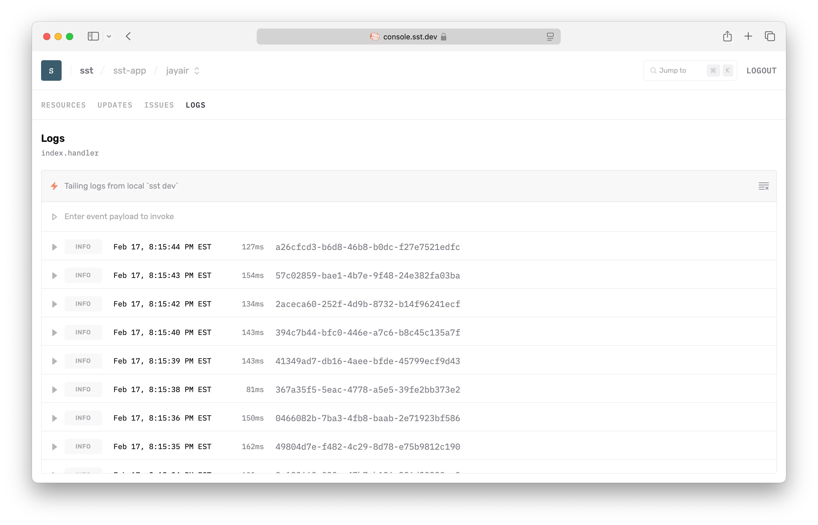 When the Console starts up, it checks if you are running sst dev locally. If so, then it’ll show you real-time logs from your local terminal. This works by connecting to a local server that’s run as a part of the SST CLI.